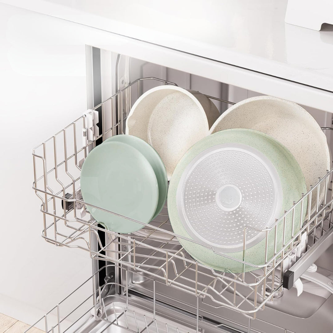 It makes cleaning effortless, saving time and water. Plus, all pieces are dishwasher safe.