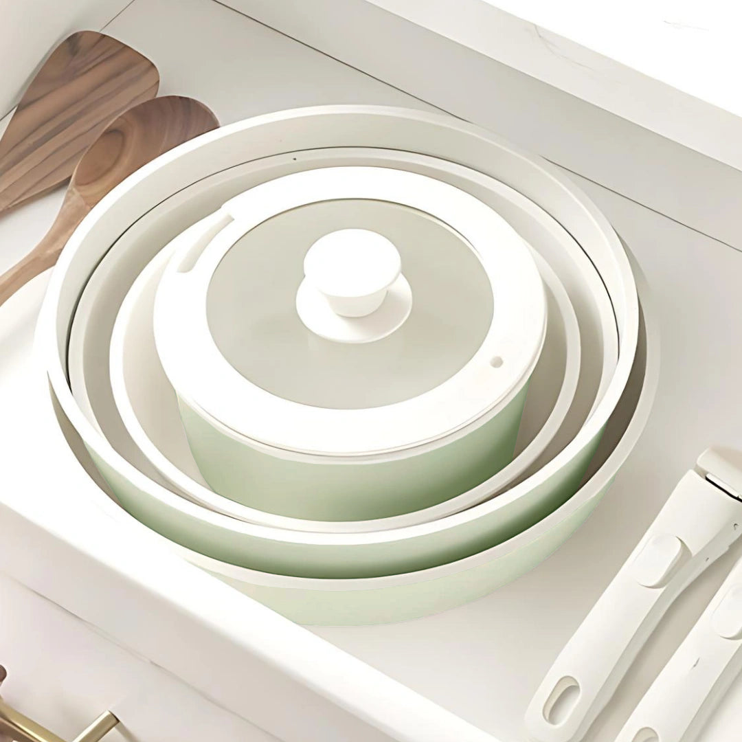The cookware set uses a detachable handle design to save storage space in your kitchen.