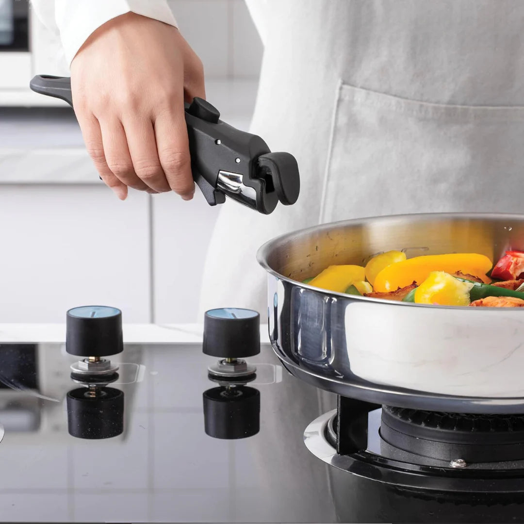 The cookware set uses a detachable handle design to save storage space in your kitchen, with pots and pans you’ll use every single day.